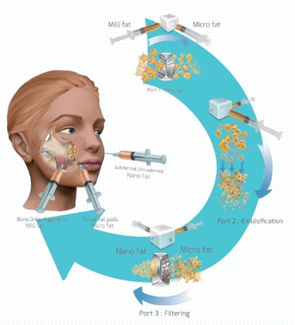 Firstly, a small amount of liposuction is performed to obtain the fat. This fat is then filtered into exteremely fine fat particles called nanofat. The fat is then centrifuged at high speed to allow the seperation of the various cellular components including the stem cells. The stem cell layer is extracted and then mixed with the nanofat. This achieves an extremely finely processed constituent of fat which contains a high density of stem cells.